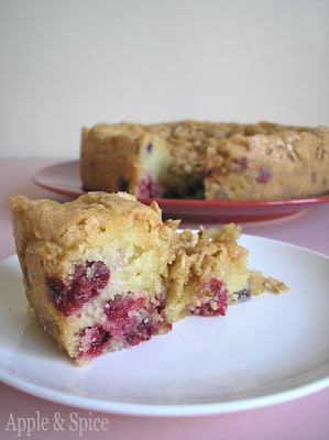 This cake is a vanilla cake which is studded with fresh cranberries and topped with an almond streusel that turns wonderfully golden and crunchy during baking, giving the cake a sort of almond Florentine crunchy topping that worked so well with the moist fluffy cake. The cranberries burst whilst in the oven creating little stained pools of ruby red juice dotted throughout the cake which made it look so appetizing.