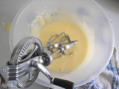 With the mixer on medium-low speed, pour the egg mixture into the bowl in a slow stream, stopping the mixer once or twice to scrape down the sides.